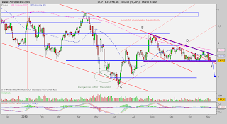 Como podemos ver en el gráfico el Banco Popular no ha podido romper la directriz bajista que viene guiando el precio desde Agosto del 2009. Como hemos visto en entradas anteriores el cnal equivalente en otras acciones sí se ha visto claramente superado al alza en acciones tanto del sector bancario como fuera del mismo.